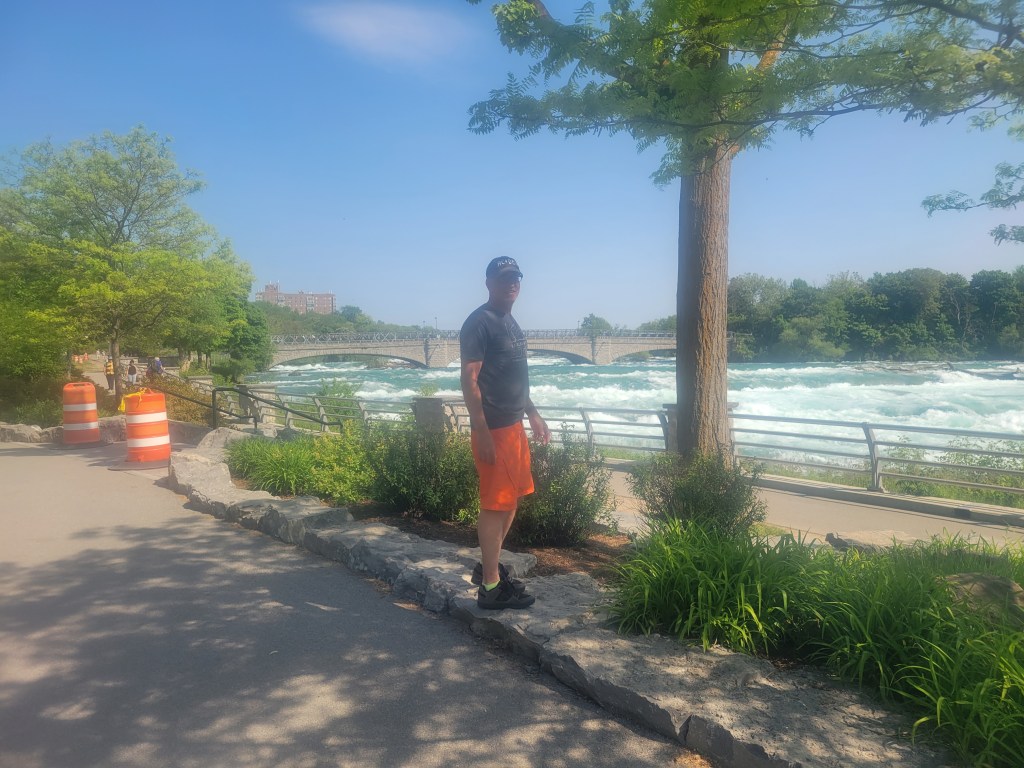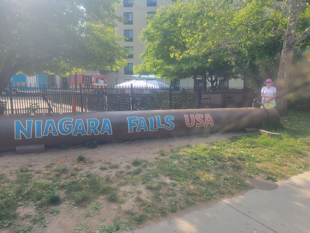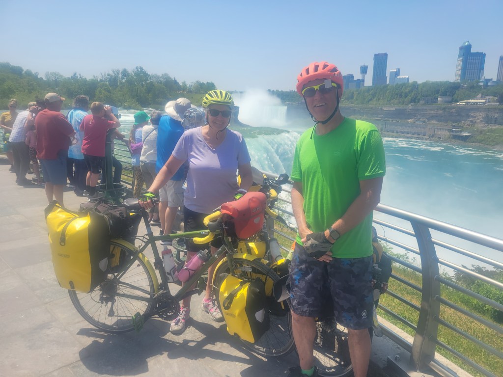Pat at the B&B had breakfast for us on the table at 5AM so we did not get on the road until sometime after 6AM. If you’re ever passing through Medina, NY I highly recommend the Garden View Bed and Breakfast, it was fabulous and we feel we made new friends with the owners Pat & Bob. A truly wonderful stay! We were back on the canal trail within 5 minutes after leaving the B&B as it was pretty much right on the canal. Trail was the same as yesterday and somewhat monotonous. We did leave the trail after the town of Lockport and was on roads and highways the rest of the way to Niagra. Tina has not fallen this trip and has on all our other trips so she is doing good. Oops, as we were crossing an intersection in Lockport I heard a scream or squel, I’m not sure which but when I turned around to see what happened Tina was off her bike and on the ground. Way to go Tina, your batting 1000! She is fine, just hurt her hip a bit. It got really warm before we arrived in Niagra and the heat from the road was brutal. We arrived in town and went straight to the falls as neither one of us have been here. The falls are beautiful. We did not get many pics today but I have posted what we have. We have a rest day tomorrow to do the tourist thing and I will post pics of our day tomorrow.