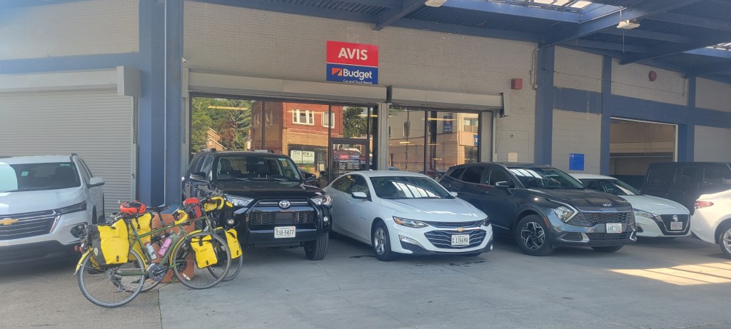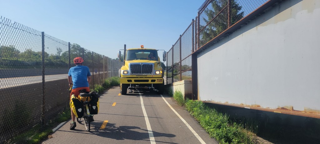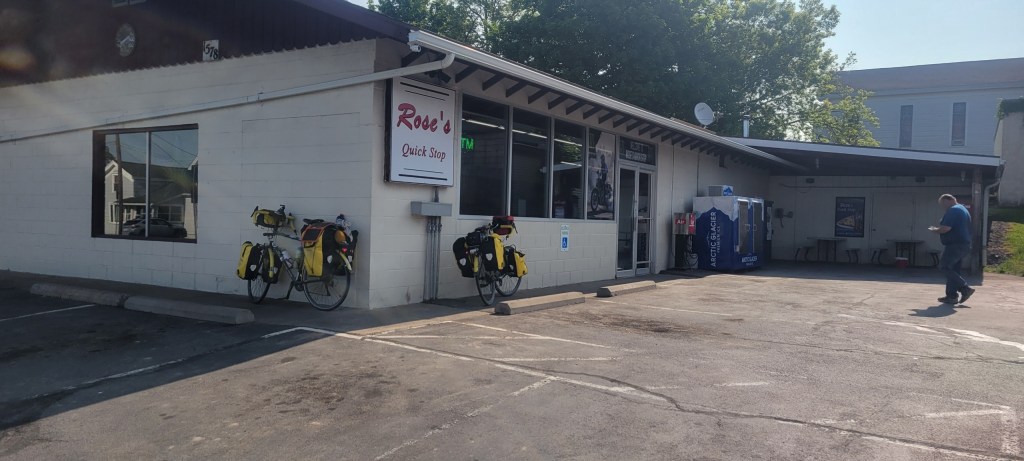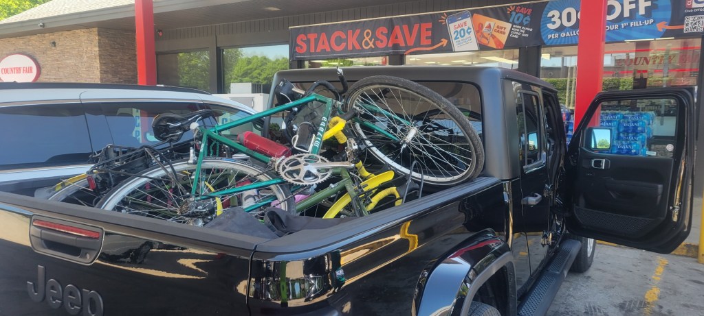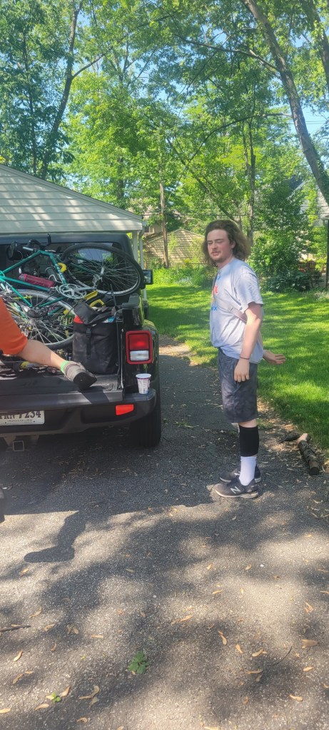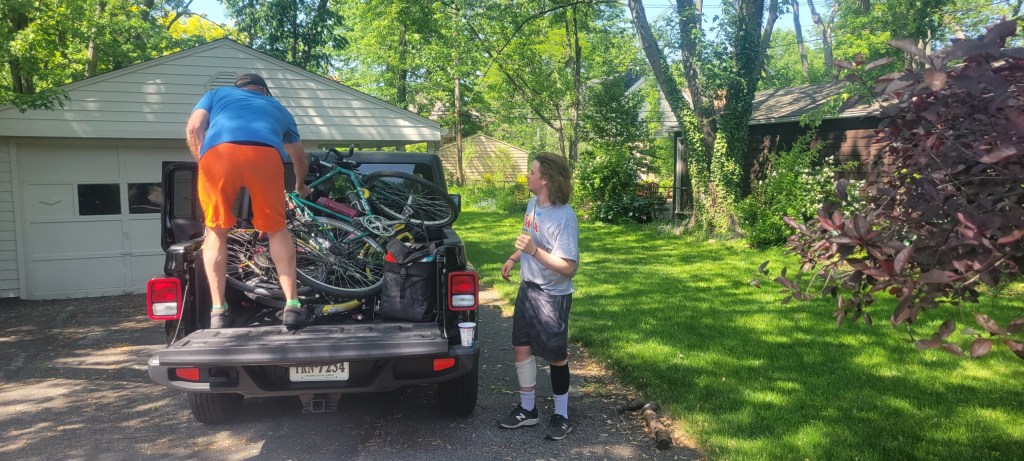 Buggy day and a rescue mission. We were on the road around 6:45AM. It was a beautiful day but lots of bugs and mosquitoes. I don’t know about Tina but I had them in my mouth and up my nose. We crossed two bridges to and from Grand Island and had to walk the bikes across so that was somewhat of a pain. Made it to Buffalo and had to ride through some sketchy neighborhoods to get to a rental car outlet. Rented a truck and loaded our bikes. The truck we reserved online was supposed to be a Toyota Tacoma but they gave us a Jeep Gladiator. Now I hope I dont offend anyone here but that vehicle has got to be the ugliest vehicle on the road! It however served its purpose in getting us from Buffalo to Cleveland where Tinas niece lives. Along the way and about 100 miles or more outside of Cleveland we spotted a solo cyclist pushing his bike and hitchhiking. We figured he had had enough of the hills as there were many along this route (part of the reason we bailed) so we stopped to help. The cyclist, a 22 year old that had started in Ottawa, Canada (Nicholas) had a broken front hub on his bike. Nothing to do but make room for him, his bike and all his gear in our ugly truck and get him to a bike shop. There was one 11 miles away in Erie, PA but when I told him we were going to Cleveland and offered to take him all that way he graciously accepted. His bike just so happened to be green in color so from this point forward we are now 3greenbikes. We made it to Tinas nieces house (Caitlin and Dillon) unloaded the ugly truck and re-loaded it with Nicholas’s bike and gear. I drove Nicholas to a bike shop but they could not work on it due to their workload and said it would be a few days. So, we got the parts and in the parking lot him and I (Ron) proceeded to install bearings and fix it and get him back on the road. We, however had some issues with it and at that point the bike shop took a look at our work but could not figure it out as well. Nicholas ended up having to leave the bike and find himself an airbnb. All good as he had a buddy bail on him after a couple days but had another buddy coming down from Canada to Cleveland on Saturday to join him on his journey. They are trying to ride all the way to California. Good luck Nicholas and keep us posted.